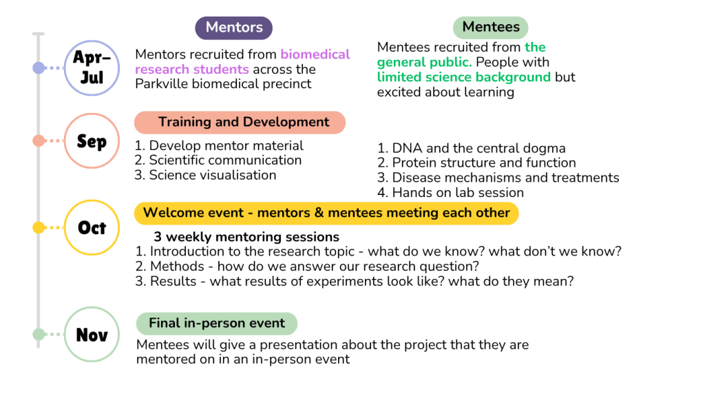 Both mentees and mentors participate in specialised training, to help them build their skills. (Mentors receive training in science communication, and mentees attend tutorials focused on the basics of medical science. Both groups participate in fun program-wide events, where they can connect with fellow participants.